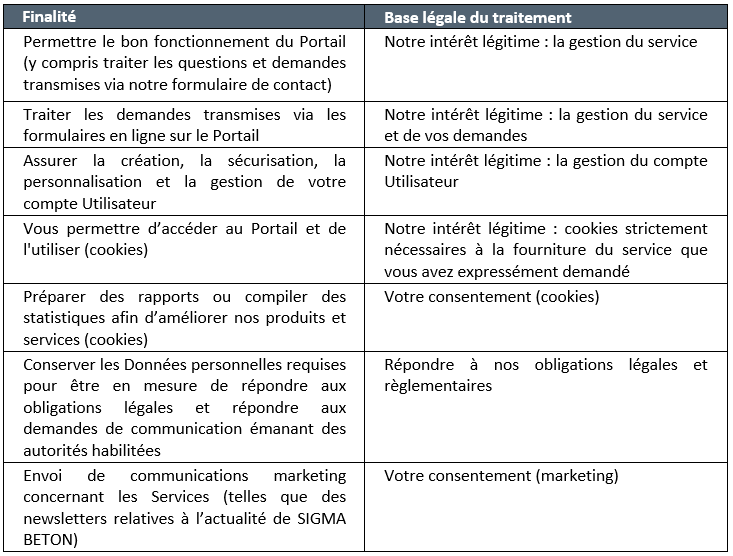 Les traitements mis en œuvre par SIGMA BETON sur le Portail concernent les utilisateurs souhaitant utiliser les Services proposés sur le Portail (les « Utilisateurs »).